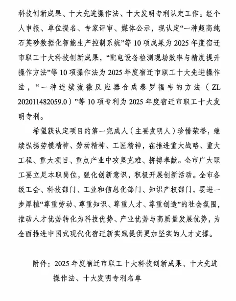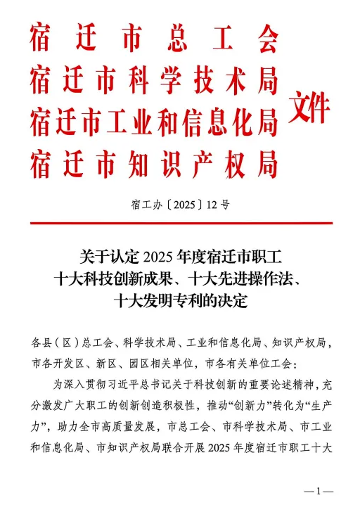 近日,宿迁市总工会正式印发《关于认定2025年度宿迁市职工十大科技创新成果、十大先进操作法、十大发明专利的决定》(宿工办〔2025〕12号)文件。在此次市级评选中
